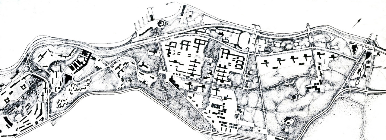 Академгородок запроектирован как взаимосвязанная пространственная открытая для развития система, позволяющая использовать территорию городка для прямых нужд центра и в качестве традиционной зоны отдыха города.