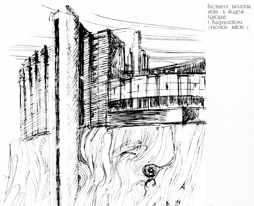Эскиз фасада здания со стороны Амурского залива. Из книги «Научный центр на Дальнем Востоке. Архитектурные решения», 1980 г.