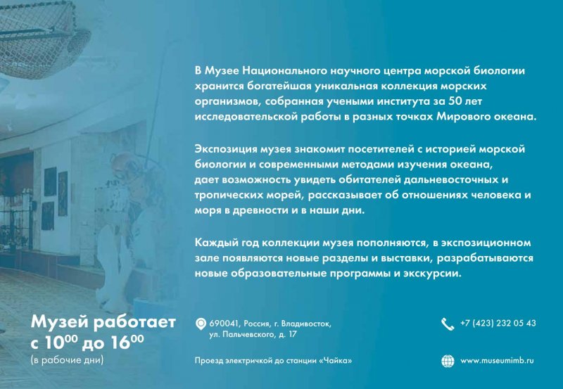 Федеральное государственное бюджетное учреждение науки «Национальный научный центр морской биологии им. А.В. Жирмунского» Дальневосточного отделения Российской академии наук представляет информационный буклет.